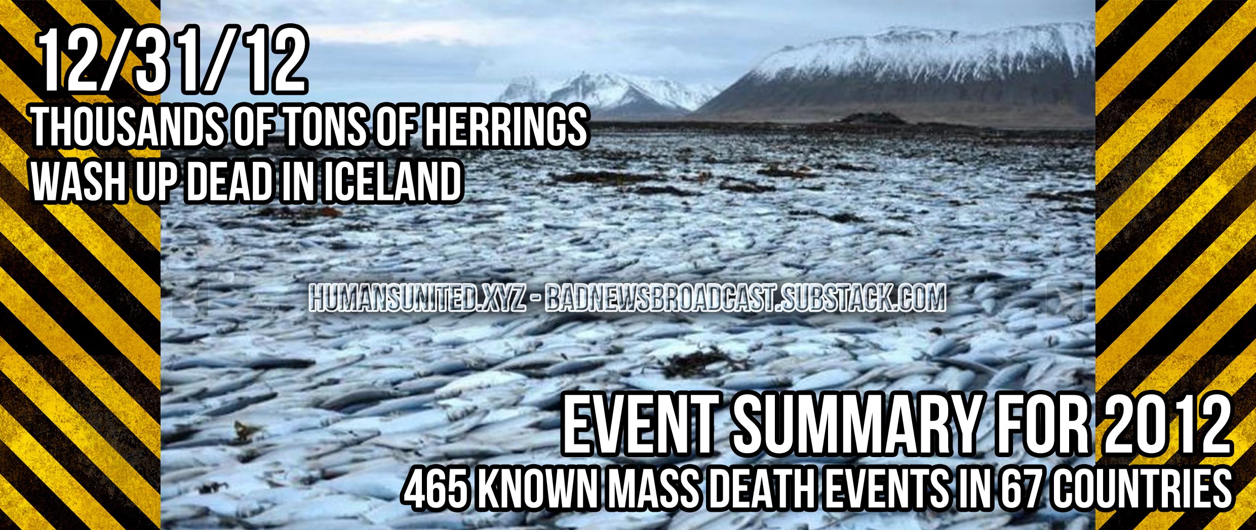 31st December 2012 – Thousands of TONS of Herring wash up dead in Kolgrafafjordur, Iceland. Link